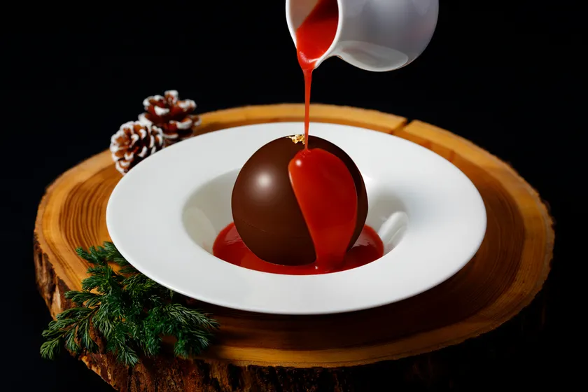 大人気のメルティームーンチョコレートがクリスマス仕様に。チョコレートでできた球体に、熱々のストロベリーソースをかけると、中からピスタチオムースとアイスクリーム、サクサクのフィヤンティーヌが現れます。ストロベリーの甘酸っぱさと、ピスタチオの香ばしさをチョコレートが包み込みます。クリスマス限定の美味しさをぜひお試しください。