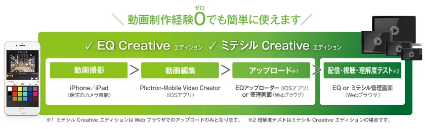 そうしたニーズに向け、Jストリームではこの度、同社が提供する動画配信プラットフォーム「J-Stream Equipmedia」と動画eラーニングサービス「J-Stream ミテシル」それぞれに、動画マニュアル制作アプリが利用できる新プラン「EQ Creativeエディション」「ミテシル Creativeエディション」の提供を開始。プラン内で利用できる制作アプリとして当社のiPhone/iPad用映像制作・編集アプリ「Photron-Mobile Video Creator」が採用されました。