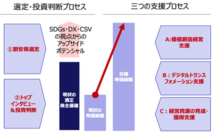 (2) トップインタビュー&投資判断:選定した投資先についてトップインタビューを行い、SDGs・DX・CSVの視点からアップサイドポテンシャルについて定量化したうえで、大きくリターンが見込める企業へ投資します。