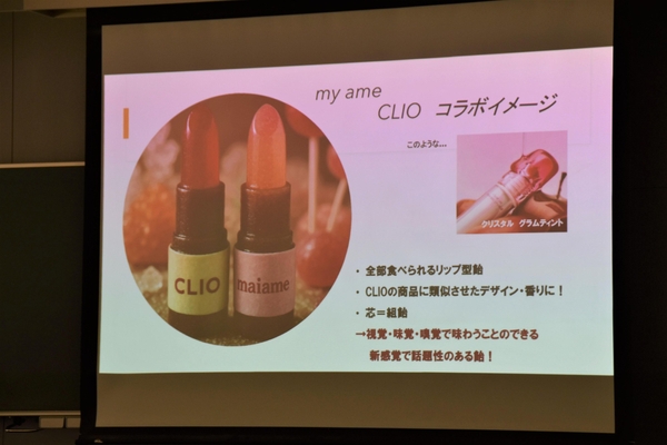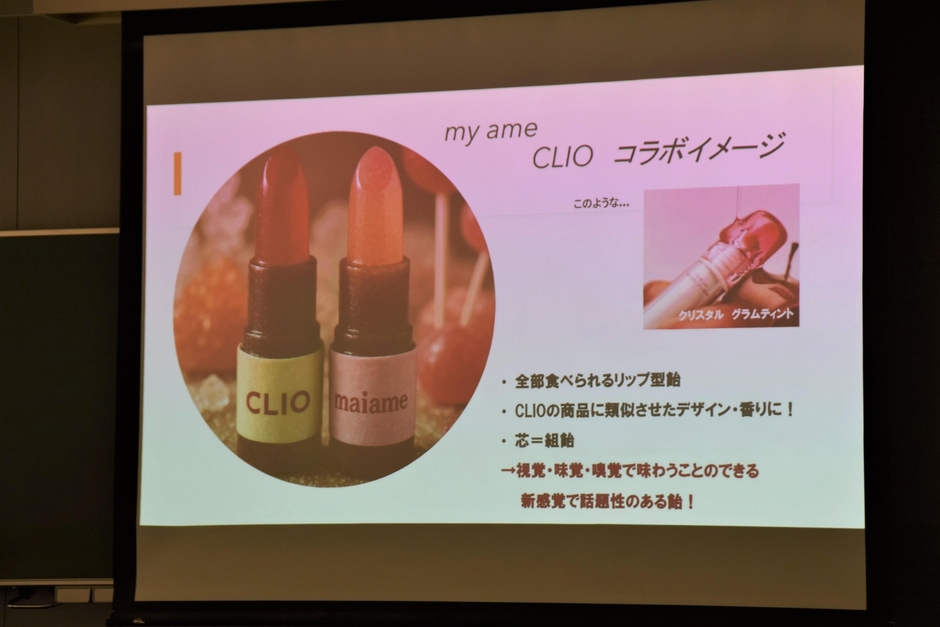講演後には学生たちが考えたコラボ商品企画の提案を聞き、中村氏が講評しました。チョコレートのパイ菓子の中にクランキーチョコ商品を組み合わせる提案では「自分にはない発想。百貨店などの高級路線で販売するのもいいかもしれない」や、化粧品ブランドの人気リップを全て飴で商品化する案には「菓子というより、コスメのプロモーションのように行うのも面白いのではないか」など、学生たちのアイデアにマーケティングの視点からアドバイスを行っていました。