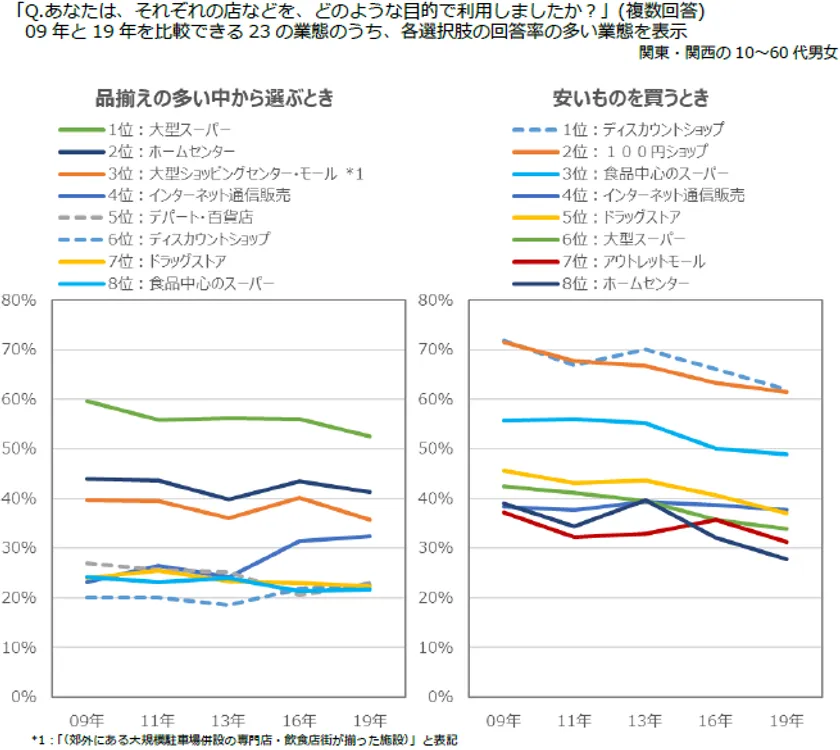 ◆利用の目的で『品揃えの多さ』の上位は「大型スーパー」「ホームセンター」「大型ショッピングセンター・モール」。いずれも09年→19年で低下傾向。