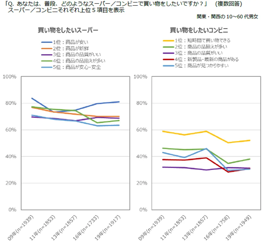 スーパーには「商品が安い」ことを求める人が8割以上、11年→19年で約8ポイント増加。コンビニには5割強が「短時間で買い物できる」ことを期待している。