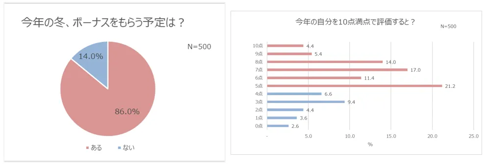 本調査では、8割以上の人が冬のボーナスをもらう予定であることや、その内ボーナスで“自分へのご褒美”を買う人は約半数以上であることが分かりました。また、今年の自分を点数で評価してもらうと、10点満点中5~10点をつけた人は7割以上となりましたが、自己評価の内容はワークライフバランスが深く関わっていることが明らかになりました。さらに、来年頑張りたいことや、働く女性にとって必須アイテムである腕時計に対する意識なども調査しました。