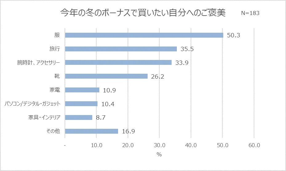 では、頑張った自分へのご褒美には、どのようなものを買うのでしょうか。ボーナスで買いたいものについて掘り下げて調査してみると、最も多いのは「服」(50.3%)、その後には「旅行」(35.5%)、「腕時計、アクセサリー」(33.9%)といった回答に票が集まりました。自分へのご褒美には、ファッションアイテムなど、仕事やプライベートで身に着けて自分自身のテンションが上がったり、自分を高めたりするものを買いたい人が多いようです。