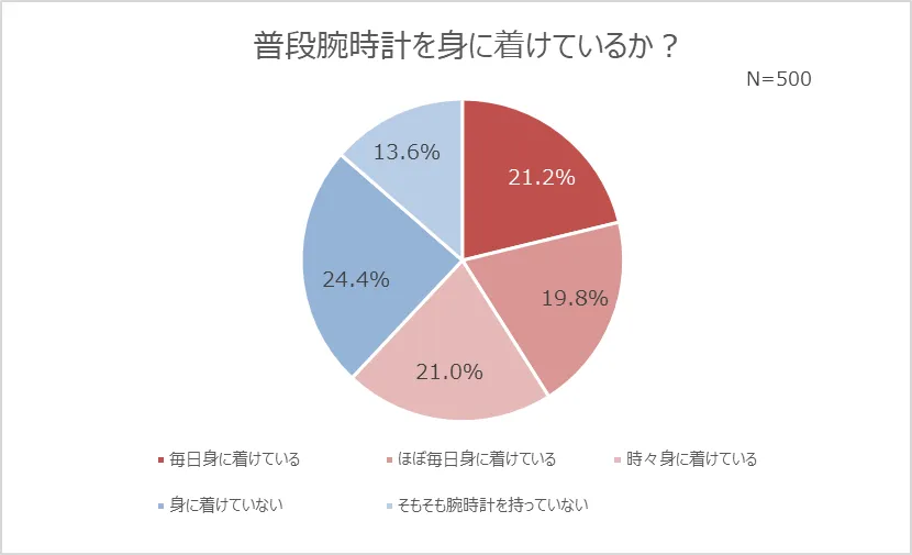 続いて、仕事を頑張る働く女性にとって重要なアイテムである“腕時計”をテーマに、アンケートを実施しました。まず、普段腕時計を身に着けているかどうかを聞いてみると、「毎日身に着けている」(21.2%)、「ほぼ毎日身に着けている」(19.8%)、「時々身に着けている」(21.0%)と、6割以上という結果になりました(62.0%)。