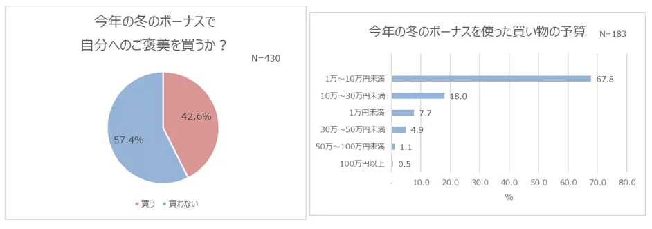 1年間の終わりに支給されるボーナスは、頑張った自分をねぎらうための買い物に充てる人も多いのではないでしょうか。そこで、冬のボーナスをもらう人を対象に、“自分へのご褒美”を買うかどうかをたずねてみると、約半数が「買う」と回答。また、買い物の予算については、「1万~10万円未満」(67.8%)が半数以上となりました。