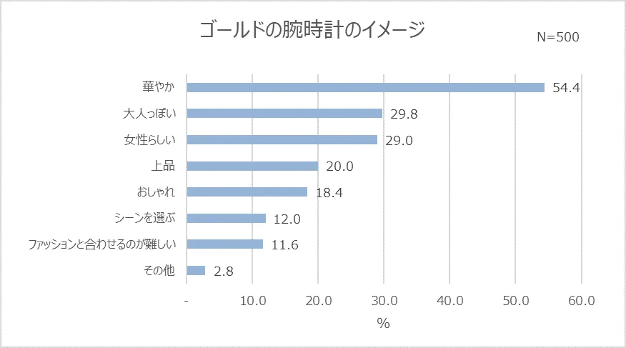 最後に、定番のシルバーの次に挑戦したい色として人気が高かったゴールドの腕時計に対するイメージを調査してみました。すると、「華やか」(54.4%)という回答が最も多く、その他には「大人っぽい」(29.8%)、「女性らしい」(29.0%)という回答に票が集まりました。また、中には「シーンを選ぶ」(12.0%)、「ファッションと合わせるのが難しい」(11.6%)とハードルを感じている人も少しいることが分かりました。一見身に着けるハードルが高い色だからこそ、“挑戦したい色”としてゴールドを検討している人もいるのかもしれません。