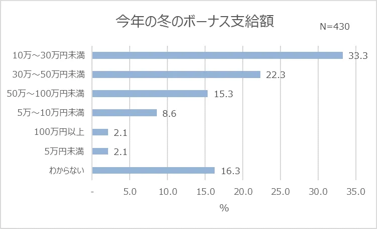 1. 今年の冬、ボーナスをもらう人は8割強(86.0%)。支給額は「10~30万円未満」(33.3%)が最多