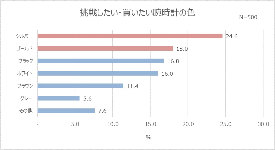 すでに身に着けている腕時計の色は「シルバー」が群を抜いて多かったですが、挑戦したい・買いたい色については、1位が「シルバー」(24.6%)、2位が「ゴールド」(18.0%)と様々な意見がありました。現在身に着けている色でも多かったシルバーは定番のようですが、“挑戦したい色”はゴールドと考えている人も見うけられ、時計もカラーを楽しみたいという人が多いようです。