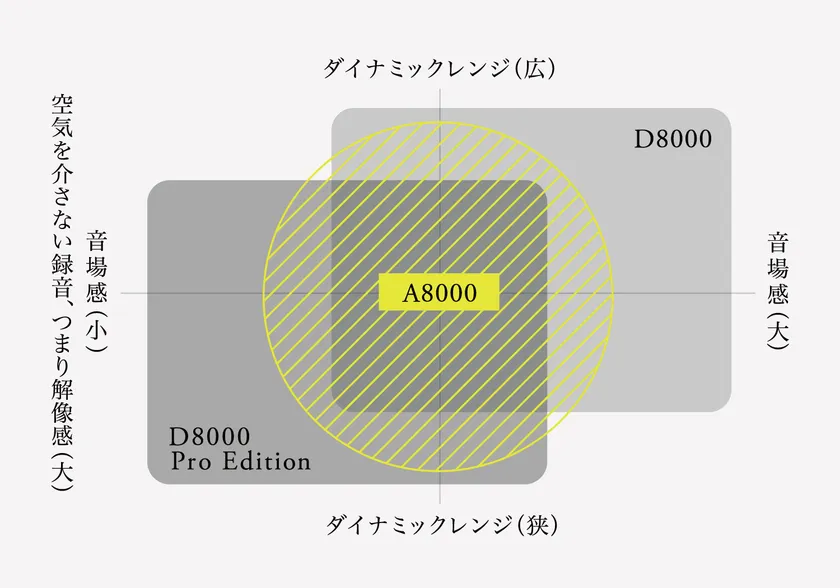 A8000はさらに時間応答に優れていることから、Dシリーズに迫る広さでダイナミックレンジの幅の狭いPOPSやロックでの解像感からダイナミックレンジの広いクラシックやジャズでの音場感まで幅広い音楽で高揚感を得られる音質となっており、この幅広さが、音圧周波数特性のみで音が作られた製品との大きな違いとなっています。時間応答の良いトランスペアレントな音は、強い個性によって少数の熱狂的なファンを生むという手法で作られた音ではなく、より高い普遍性をもっています。それがA8000の最も大きな特長と言えます。