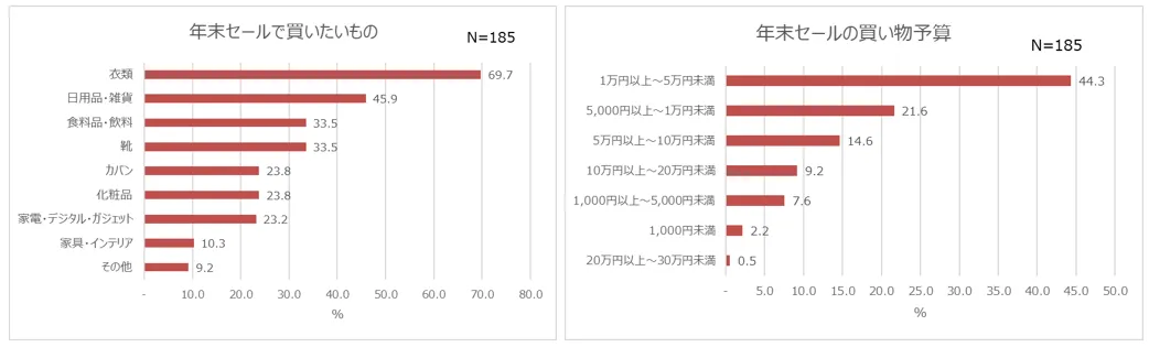 さらに、年末セールで買いたいものについて掘り下げてみると、最も多いのは「衣類」(69.7%)でした。以前から気になっている洋服が値下げされているのを狙って購入したり、単価の高めな冬服をお得にまとめ買いしたりすることがイメージできます。その他には、「日用品・雑貨」(45.9%)、「食料品・飲料」(33.5%)といった回答にも票が集まりました。日頃から必要なものだからこそ、セールというお得な機会にまとめ買いする人が多いのでしょうか。