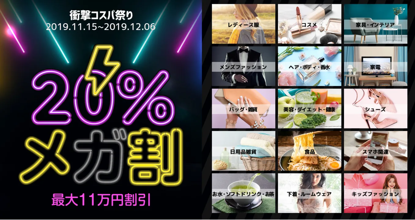 Qoo10では、2019年11月15日(金)から12月6日(金)までの期間限定で、年末に向けてのスペシャルセール「衝撃コスパ祭り」を開催します。期間中には“衝撃”を受けるお得さの「20%メガ割引クーポン」で、最大11万円分割引になります。お得に買い物をする絶好のチャンスですので、お見逃しのないようご利用ください。