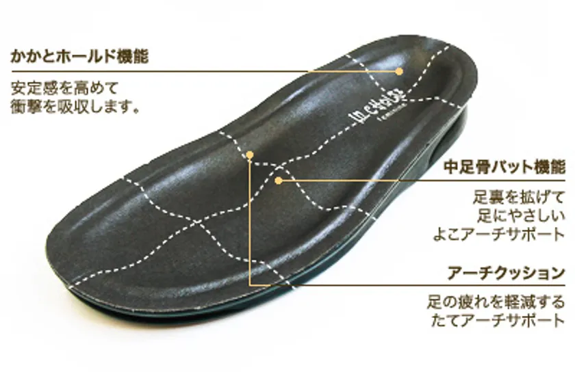 ドイツの「人間工学に基づく靴造り」をベースに、足をベッドで休ませるという発想から生まれた機能性の高いオリジナルのソール。ソフトウレタンソールが着地時の衝撃を吸収。足・膝・腰などにかかる負担を軽減します。