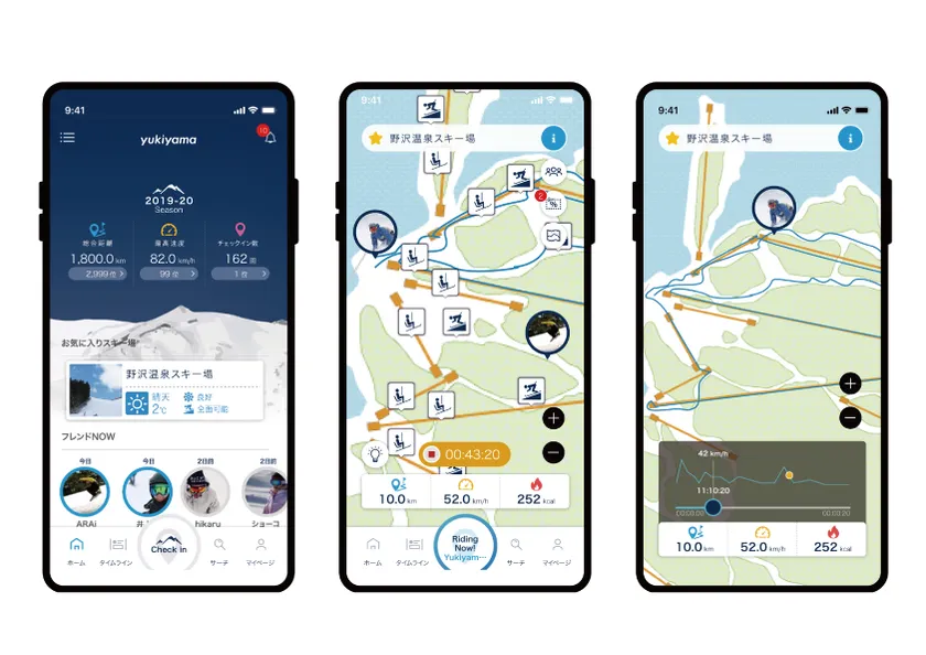 yukiyamaアプリはこれまで紙で配布されていたスキー場マップをGPSマップに変え、全ての情報を手の中のモバイルで完結させるだけでなく、仲間の「今」をリアルタイムに確認できるコミュニティ機能やデジタルクーポンなど、全国約400のスキー場を1つのアプリで遊び尽くす事を可能にしました。また、スキー場のデジタル化を目指し、リフトの運行情報やパーク情報などの一括管理、来場者への情報発信やデータ分析などのサポートも行っています。現在は、全国100近くのスキー場と契約し、スキー場来場者とスキー場マーケティングの双方向からアプローチする事で新たな価値観を生み出していきます。