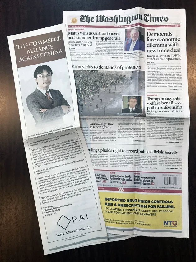 米ワシントン・タイムズ紙に掲載された日本からの意見広告の例