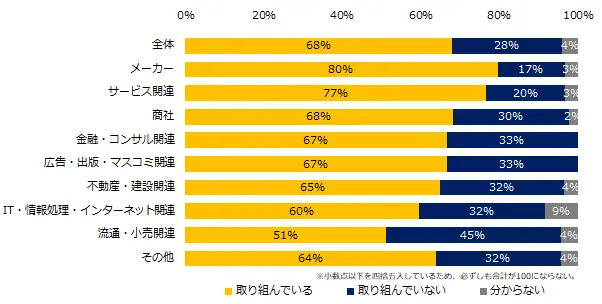 「現在、社内の禁煙に取り組んでいますか?」と伺うと、68%が「取り組んでいる」と回答しました。企業規模別では「1000名以上」(78%)、業種別では「メーカー」(80%)がそれぞれ最多でした。企業規模が大きくなるにつれ、禁煙に取り組む企業は増えるようです。