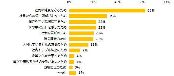 「社内禁煙に取り組んでいる」と回答した企業に取り組む理由を伺うと、第1位は「社員の健康を守るため」(63%)でした。次いで、「社員から苦情・要望があったため」(31%)、「働きやすい職場にするため」(22%)、「世の中の流れを感じたため」(22%)でした。