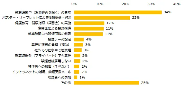 禁煙の具体的な取り組みを伺うと、第1位は「就業時間中(お昼休みを除く)の禁煙」(34%)でした。次いで、「ポスター・リーフレットによる情報提供・啓発」(22%)、「健康教育・健康指導(講習会)の実施」(12%)でした。「その他」(25%)と回答した企業からは、「社用車内の禁煙」「空間分煙」「喫煙所をビル内の他事業所と折半して設置」などの取り組みがありました。