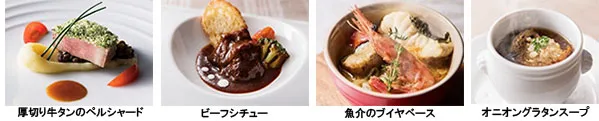 お好きなものを何度でもお席までお届けするテーブルオーダー制メニューはディナータイムだけのお愉しみ。「ビーフシチュー」や「オニオングラタンスープ」など、全8種類の料理を食べ放題にて提供いたします。