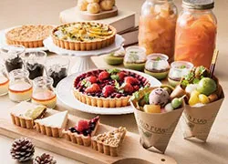 お好みのトッピングで愉しむ「エッグワッフル」に抹茶味が登場。小豆シャーベットや白玉、和三盆ソースのトッピングで和スイーツに。「抹茶のブランマンジェ」や4種類のタルト(ショコラオランジェ・ベリー・ノワ・フロマージュ)もおすすめ。
