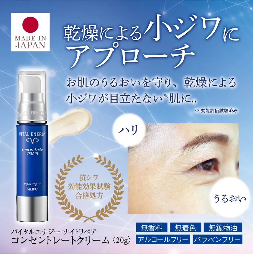 株式会社メイコー化粧品(本社:大阪市、代表取締役社長:河野 克行)は、12月1日(日)にお肌のうるおいを守り、乾燥による小ジワが目立たない肌に整えるクリーム「バイタルエナジー ナイトリペア コンセントレートクリーム(20g)」を発売いたしました。