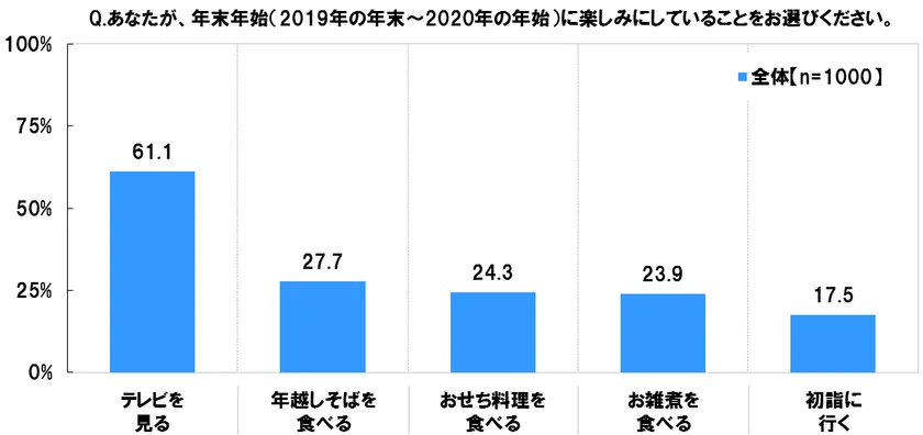 とはいえ、それ以降には「年越しそば」「おせち料理」「お雑煮」と続きました。きっと美味しいものを食べながら、テレビを見て年末年始の雰囲気に浸るという方が多いのではないでしょうか。テレビはそれ単独だけでなく、色んなことをし“ながら”でも楽しめるのが魅力なのかもしれません。初詣でも友人・知人に挨拶しつつ、「あの番組、見た?」なんて会話が聞こえてきそうです。