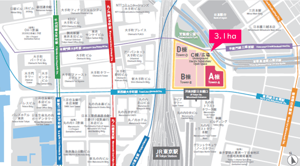 大手町・丸の内・八重洲・日本橋の結節点に位置する、東京駅前の広大な敷地を誇る特別な街区。オフィスワーカー・エリアリピーター・観光客が集まる、東京でも希少な環境です。