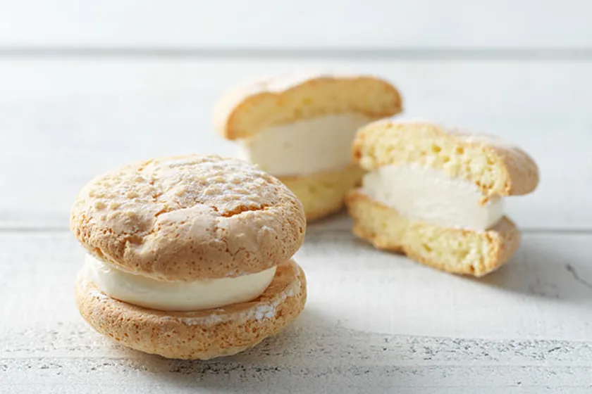 北海道十勝のジャージーミルクを使用したジャージーミルクジャムクリームをふんわりブッセでサンドしました。