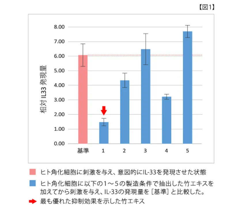 粉砕した竹をそのまま溶媒に浸して抽出したエキスには特に効果は認められませんでした。そこで、竹にさまざまな前処理を行ったうえで抽出を試みたところ、粉砕した竹を70℃で焙煎しさらに天日乾燥し、30℃の環境下で抽出したところ、エキスに明らかな臨床的な効果を感じるに至りました。そして、ヒト表皮角化細胞を用いたIL-33の発現抑制効果を測定したところ、IL-33の発現を大幅に抑制する結果が得られました。
