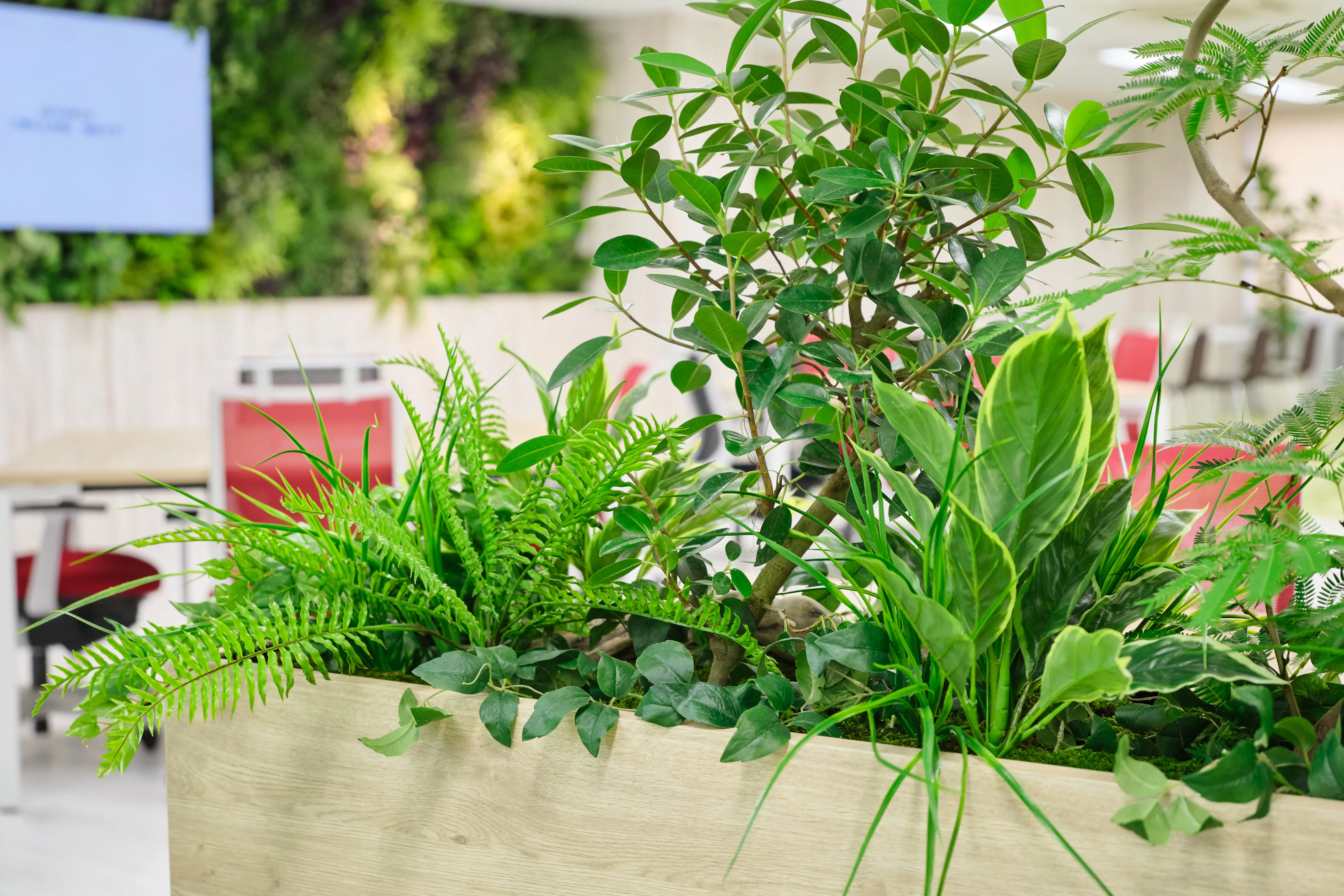 ・オフィスを取り囲む多数の観葉植物。グリーンを潤沢にちりばめ、心休まる空間を演出