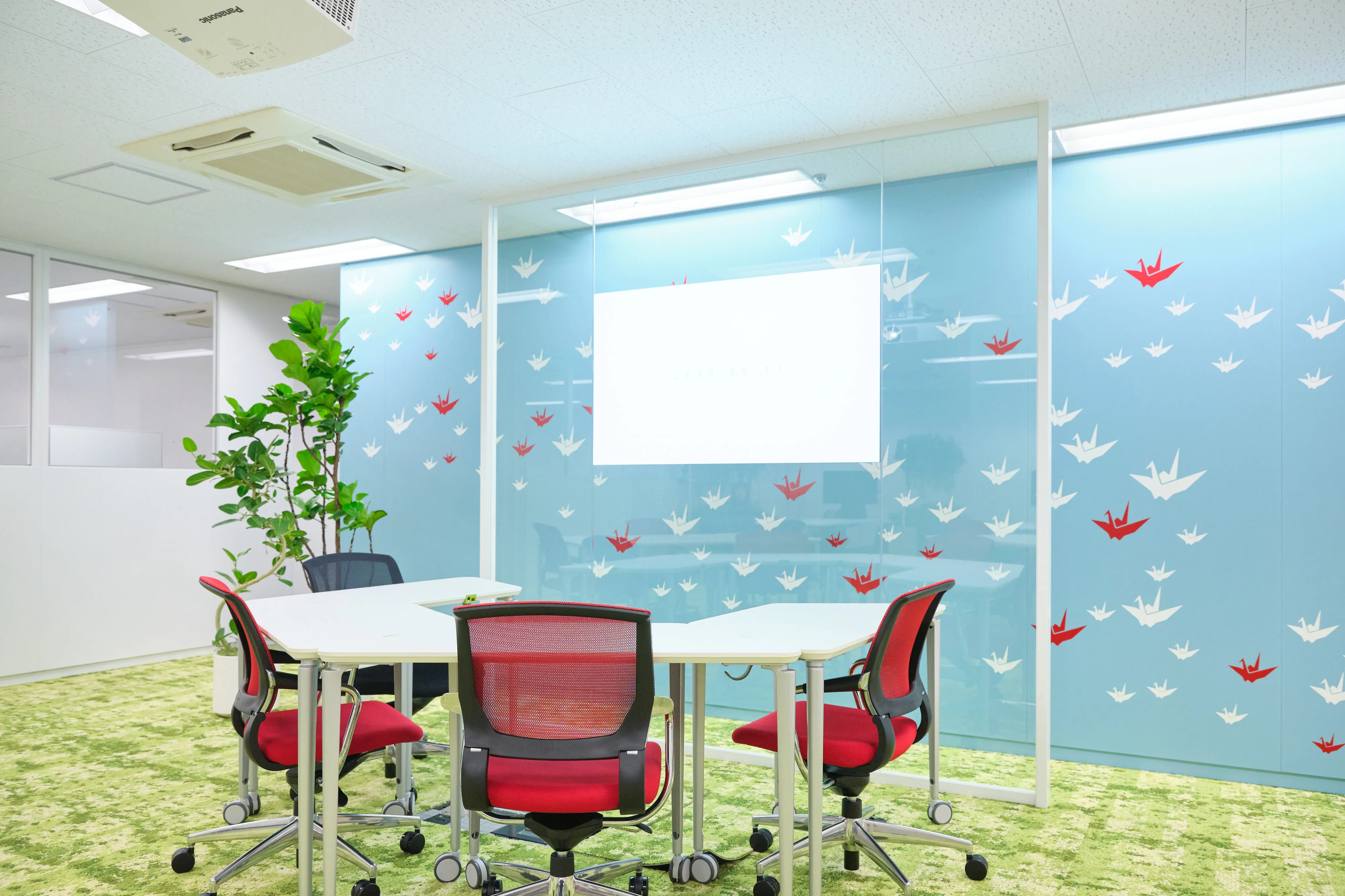 メインフロアを一番奥まで進んだ突き当りには『折り鶴の壁』を設置。平和への祈りを込めて、オフィスから徒歩5分の場所に位置する広島平和記念公園「原爆の子の像」に捧げられた「折り鶴」を描きました。(※2)