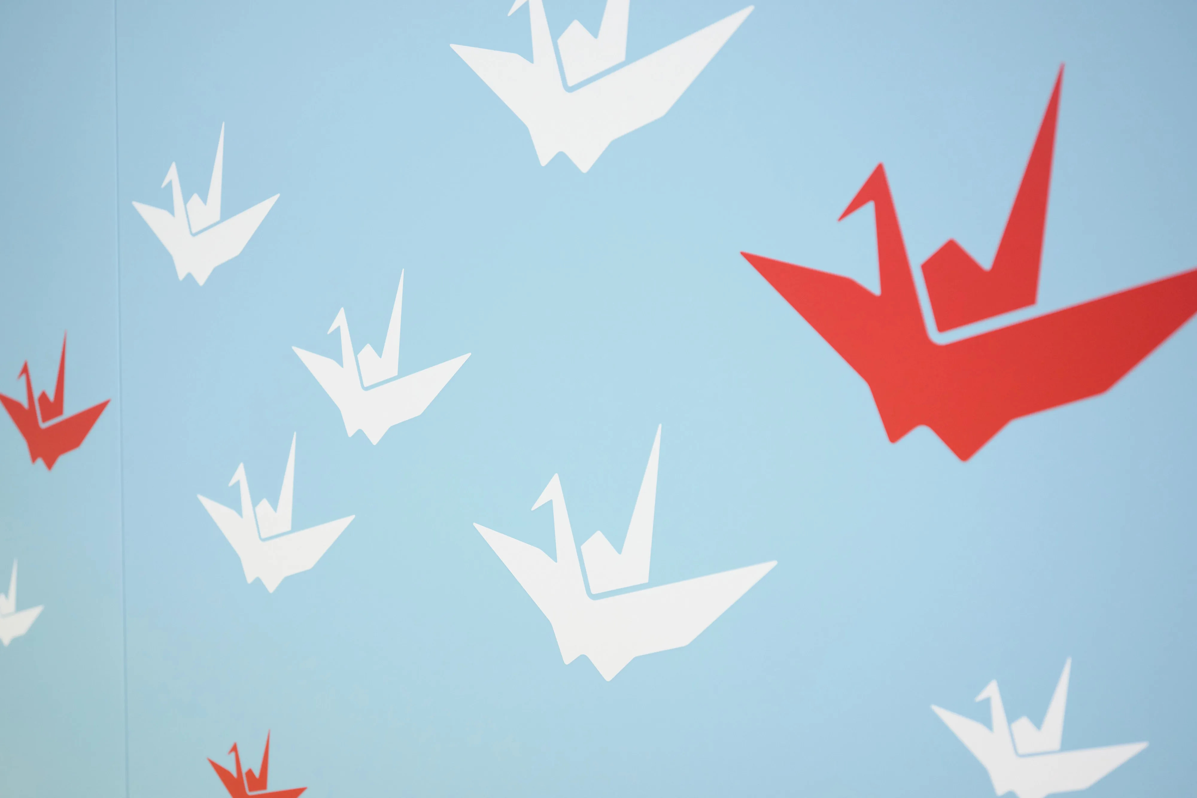 「折り鶴」に託された【平和】への強い想いを望んで、当社の壁面にもデザインしました。