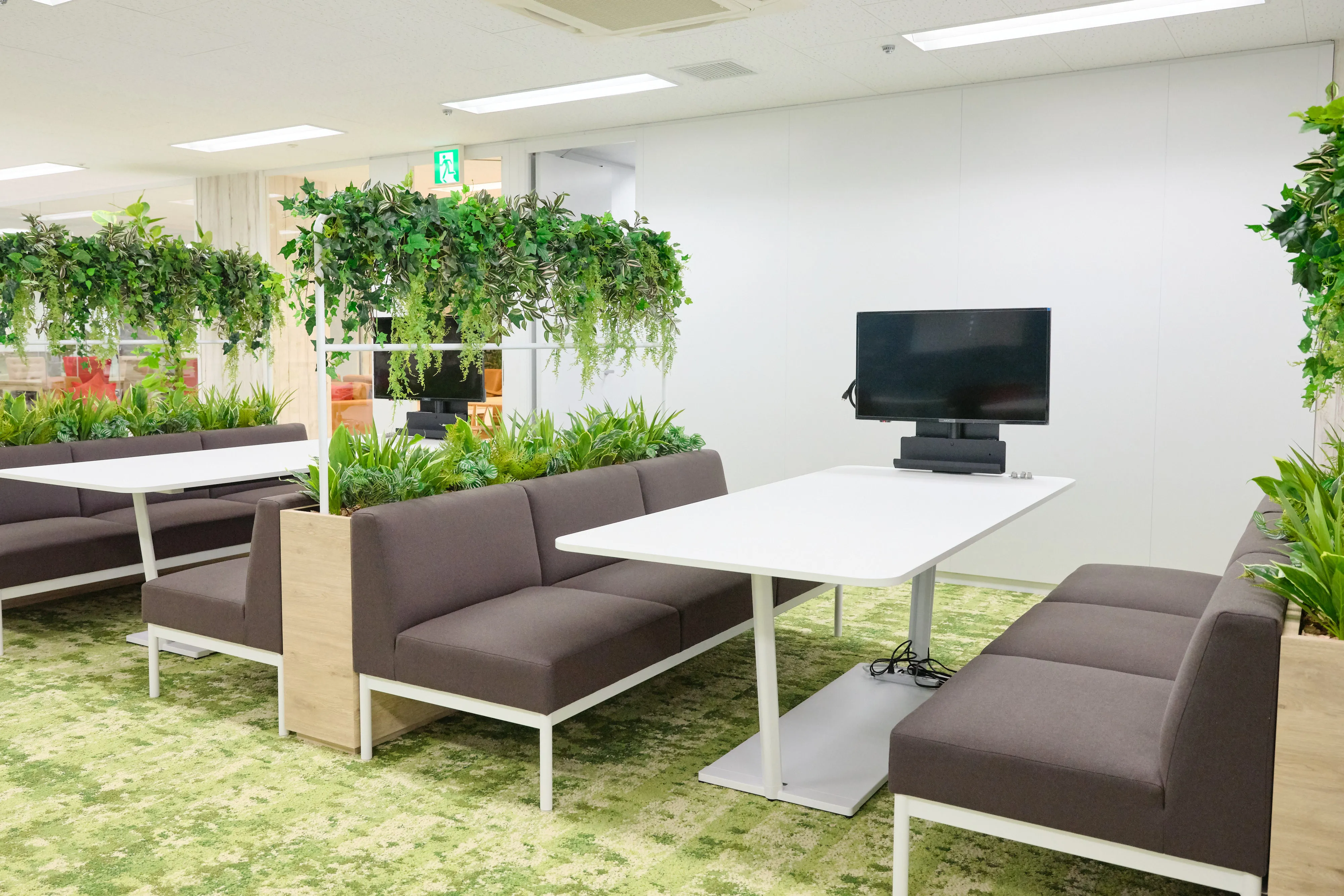 広島オフィス「U BASE PEACE」は、そんな広島市のイメージにあわせてマイナスイオンたっぷりの美しい『緑』をフロア全体にちりばめています。オフィス内には生木のグリーンを多数配置し、平和都市【広島】のように、ここで働く社員が心休まる空間で緑に囲まれながら植物の生命力を感じてイキイキと働けるよう、演出しました。目にも優しいグリーンカラーは、リラクゼーション効果も。