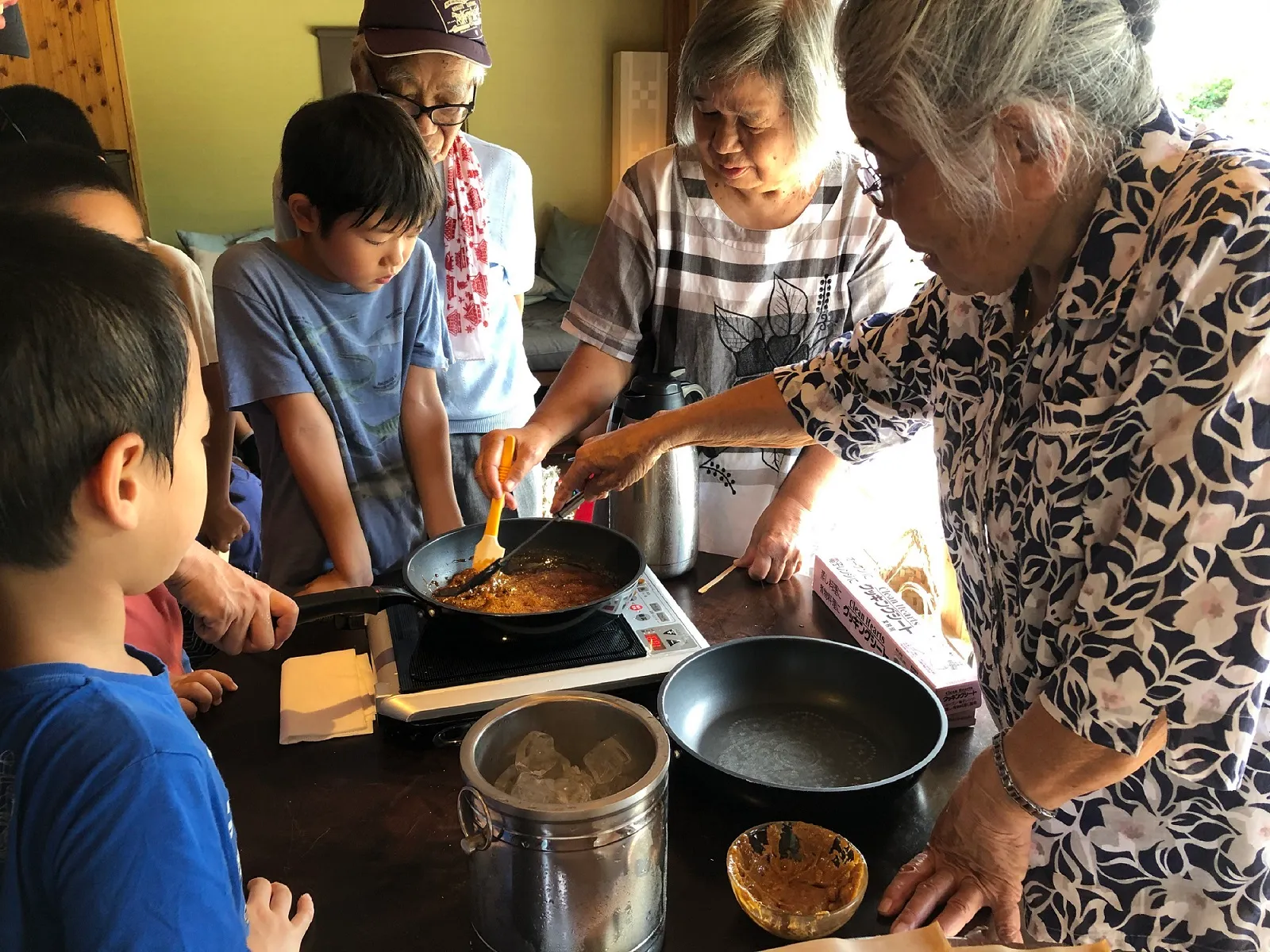 星のや竹富島で行っていた催し「黒糖チャレンジ」をアレンジして、星のや竹富島ならではの体験で命草に親しみました。黒糖チャレンジとは、黒糖蜜を煮詰めて黒糖を作る催しです。今回は、命草である長命草やピーヤシ味のちんすこうを混ぜて、黒糖作りに挑戦しました。固めるのが難しく、黒糖の飴が出来上がりましたが、子どもたちはおいしいと頬張っていました。
