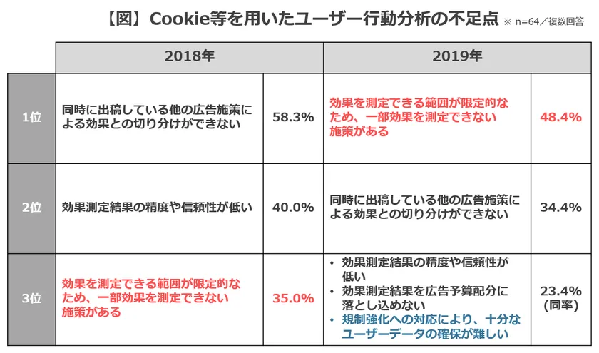 これらの調査結果から、Cookie等を用いたユーザー行動分析が依然としてポピュラーな効果測定手法としてマーケティング現場で用いられながらも、効果測定手法として昨年の調査時より強く不足を感じる方が増加している現状がうかがえました。