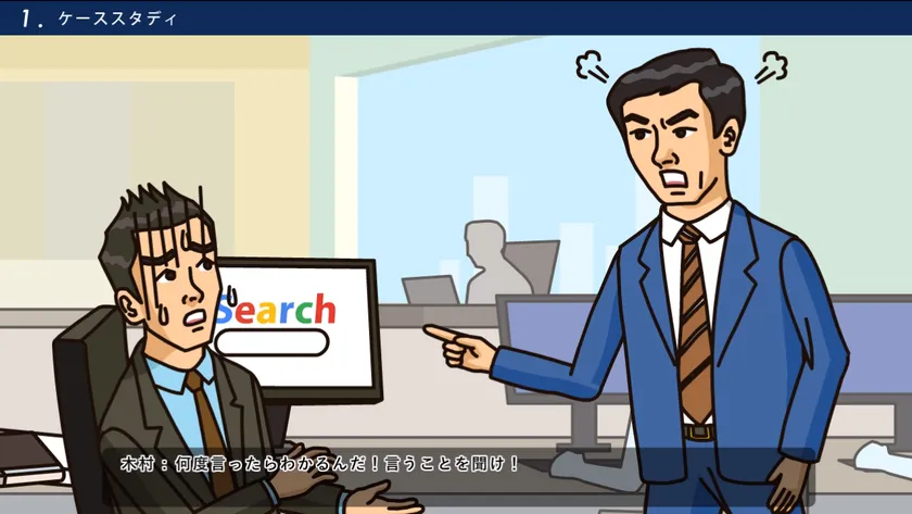 「知って役立つ!管理職のためのハラスメント講座」では、具体的なケースをもとに職場で起こるハラスメントについて解説します。その途中で問題が出題され、自分で考えながら進む構成になっています。管理者としての対処法や、会社がとるべき予防法についてもあわせて学習できます。