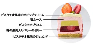 ピスタチオ風味のジョコンドの上にピスタチオブリュレとベリーのゼリーを閉じ込めた苺ムース。周りをアーモンド入りチョコでコーティングし、ピスタチオ風味のホイップクリームと苺風味のチョコ、苺でデコレーションしました。