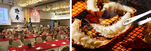 オマール海老の磯焼き レモン添え、鮑の海藻蒸し、フォアグラのソテー トリュフソース、黒毛和牛ロース肉のローストビーフ、ふかひれラーメン、黒豚のオイルポン酢フォンデュ、にぎり寿司 他、多様なメニューをご用意