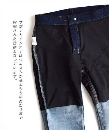 ヒップアップデニムスキニーパンツの内側には、ウエスト下から太ももの部分にかけてサポートインナーが内蔵されています。このサポートインナーがヒップの丸みを失うことなく腰回りと太ももを程よく引き締めるため、ただ穿くだけでヒップアップと美脚が叶います。