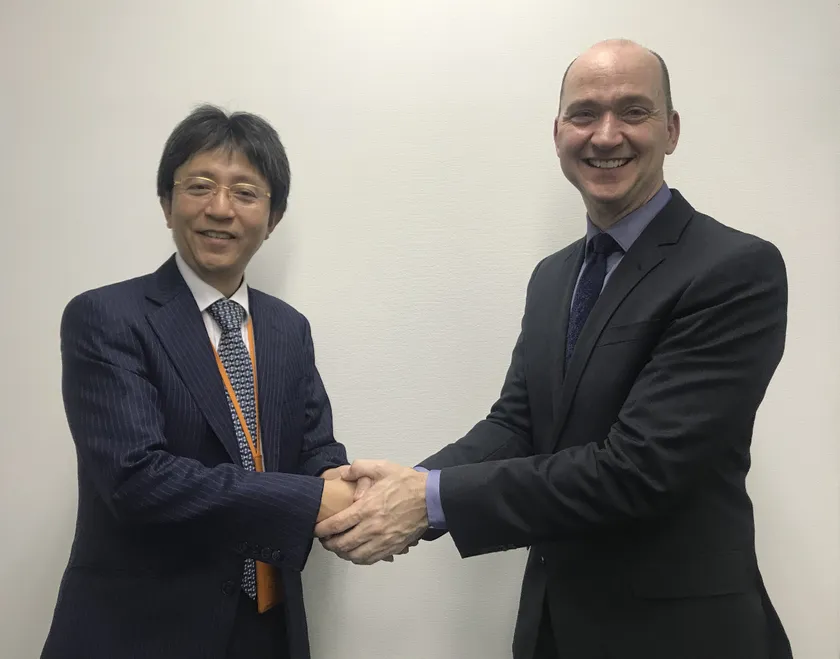 両社の代表者が調印式にて握手