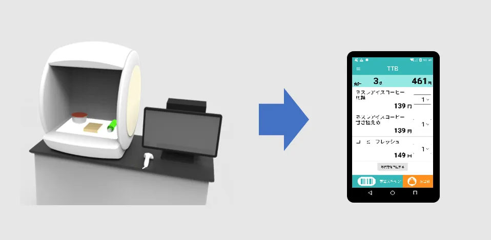 [1] カメラ付きの専用台に、複数の商品を並べ、画像認識により一括で商品を特定します。