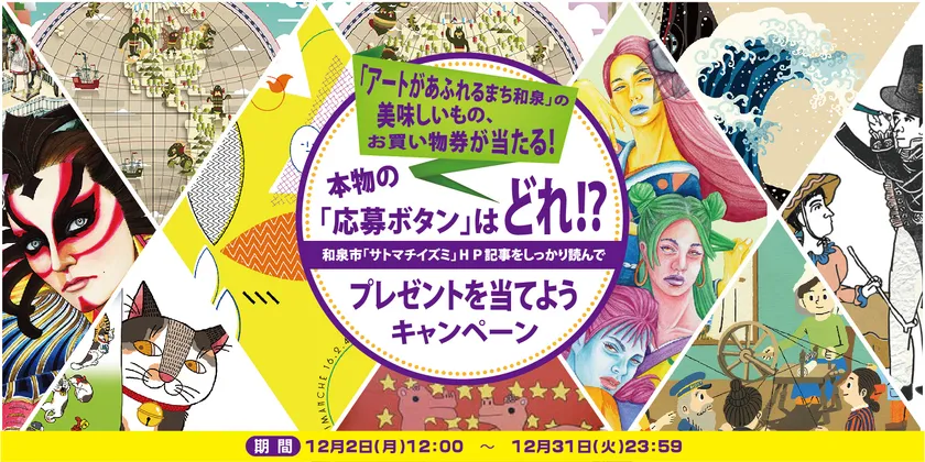 和泉市と、株式会社デイリー・インフォメーション関西は、12月2日(月)より、和泉市観光サイト「SATOMACHI IZUMI(サトマチイズミ)」をご覧いただき、「アートがあふれるまち和泉」を感じながら、指定の条件を満たして、応募すると、抽選で6名様に和泉市の美味しいものや、「和泉市いずみの国観光おもてなし処」で使える、お買い物券が当たるキャンペーンを実施します。