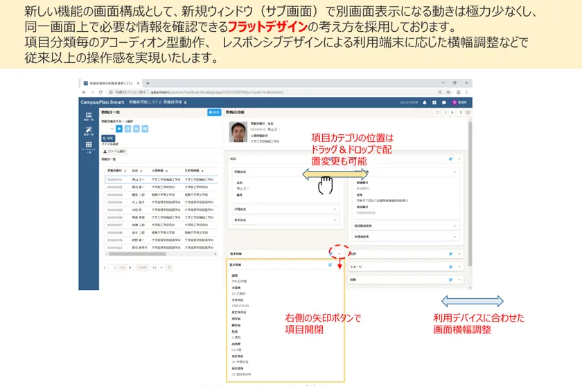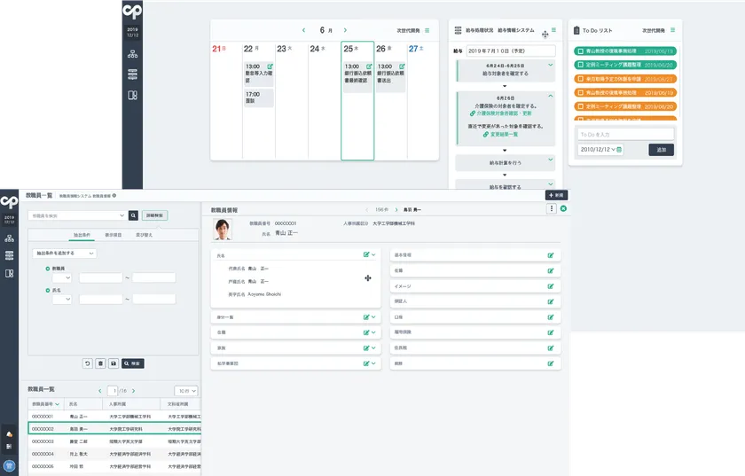 今回は第一弾として、『キャンパスプラン』シリーズのラインナップの中から、法人系シリーズ『学校法人人事情報システム』、『給与情報システム』を販売開始致します。『学園総合情報システム CampusPlan Smart』全体のコンセプトに基づいて、パフォーマンスや使い勝手を大幅に向上させていることは言うまでもなく、年末調整を始めとする教職員の方々からの申請作業をWeb経由で発生源入力できる機能を搭載する等、従来の『学校法人人事情報システム』、『給与情報システム』を凌駕するシステムに仕上がっております。