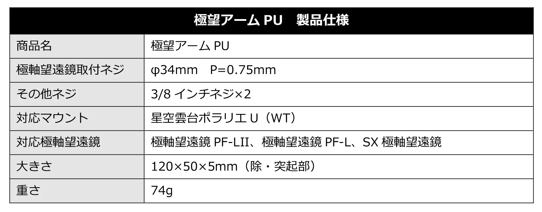 ※極軸望遠鏡PF-LIIは、現在発売中の商品です。極望アームPUとのセットを関連アクセサリーとして新発売します。