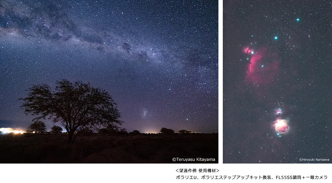標準装備の雲台ベースをポラリエ用マルチ雲台ベース(別売)と差し換えて取付けできます。スライド雲台プレートDD(別売)などの併用により、カメラ用望遠レンズやビクセンFL55SS鏡筒などの小型天体望遠を搭載した天体撮影にも対応。広角から望遠まで幅広い焦点距離での星空撮影が可能です。