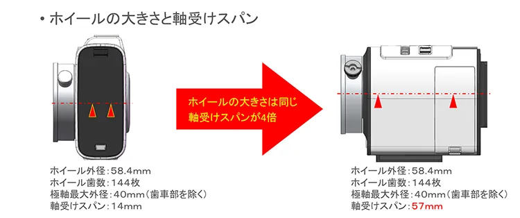 回転軸を支える2つの軸受け間距離を従来比約4倍にするなど構造の見直しにより、従来品より本体重量20%以上を削減しながら搭載力の大幅な向上を実現しました。※1