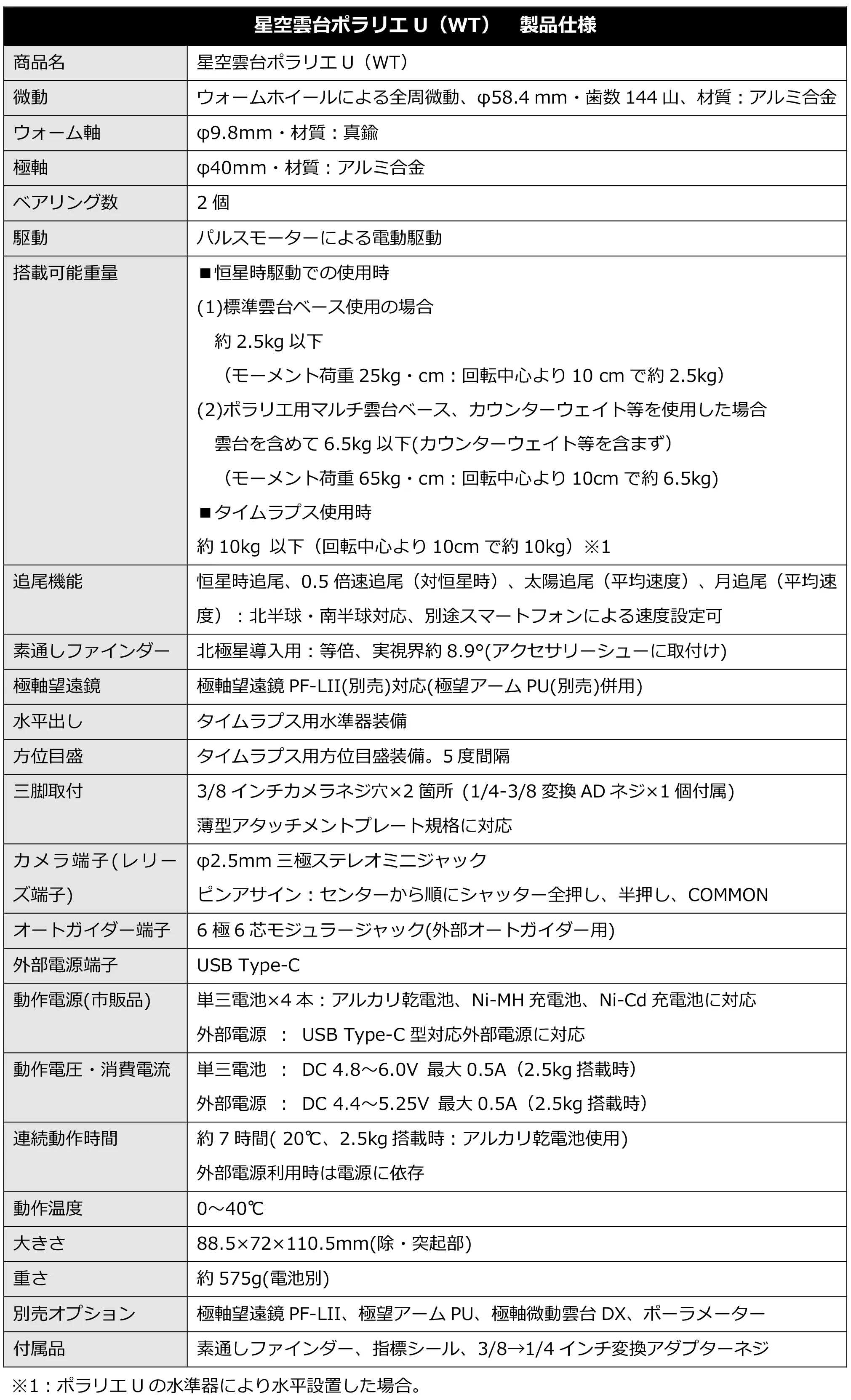 総合光学機器メーカー株式会社ビクセン(本社:埼玉県所沢市、代表取締役:新妻和重)は、ポータブル赤道儀 「星空雲台ポラリエ」のアップグレードモデル『星空雲台ポラリエU(WT)』と、関連アクセサリーを2020年1月下旬より発売。2019年11月28日(木)から先行予約も開始します。
