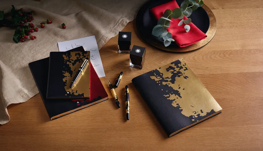 洋の東西を問わず芸術の域まで達している「てがき」の世界…。モンブランの「マイスターシュテュック カリグラフィー コレクション」は、モンブランが誇るクラフツマンシップと最先端のテクノロジーの融合から生まれた、全く新しいペン先を持つ万年筆です。このコレションに搭載された「フレキシブルニブ」と呼ばれるペン先は、筆圧によって自在に線の幅を変えることができ、思うままにアーティスティックなライティングを楽しめます。書くこと・描くことが大好きな方に送りたい逸品です。ヨーロッパの王族や貴族などの特権階級の豪華な手書きの写本に見られる金箔をモチーフにしたおそろいのノートブックも添えて…。