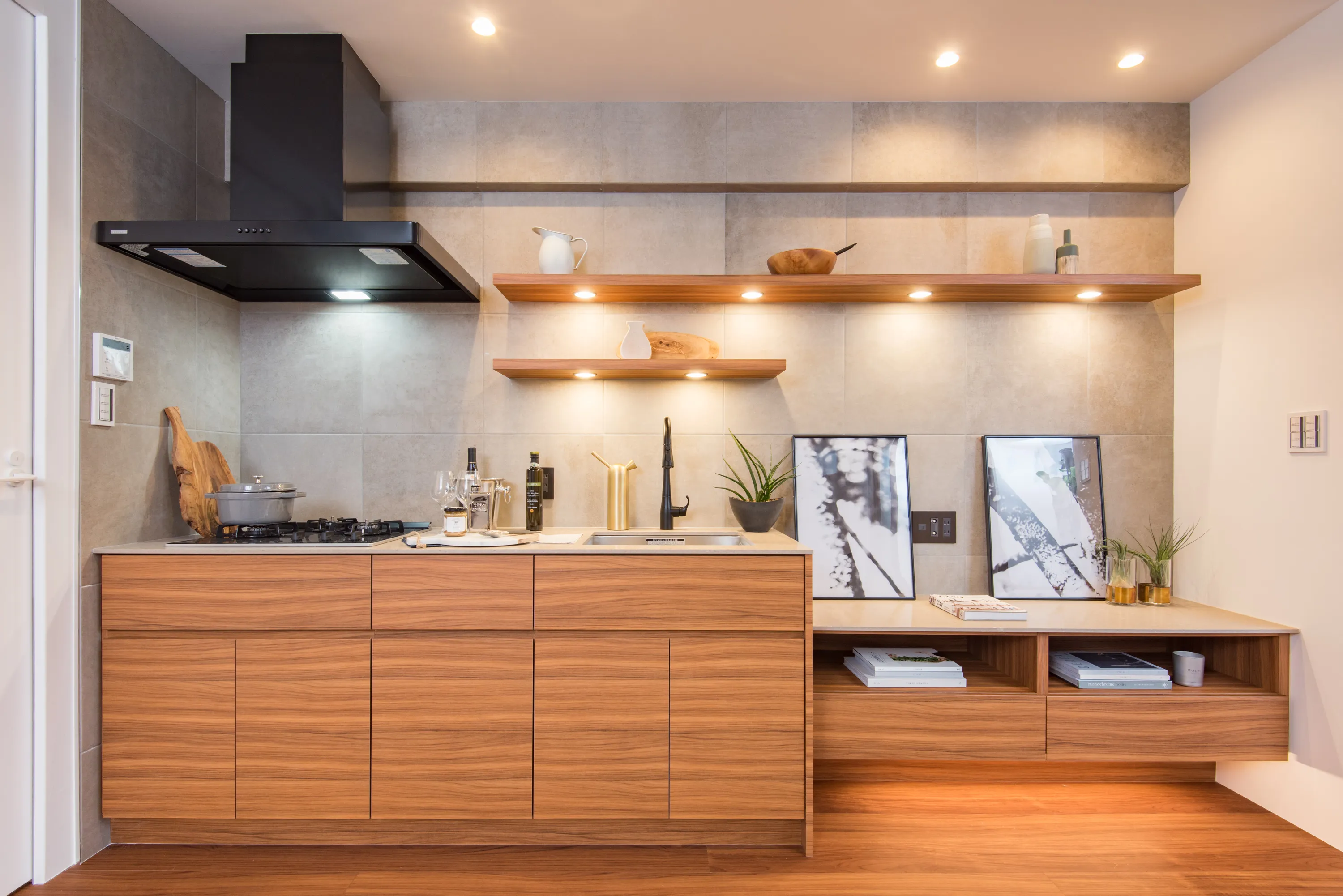 ・壁面は天板のグレーと色を合わせた高品質のセラミックタイルを採用し、部屋の意匠を統一しています。