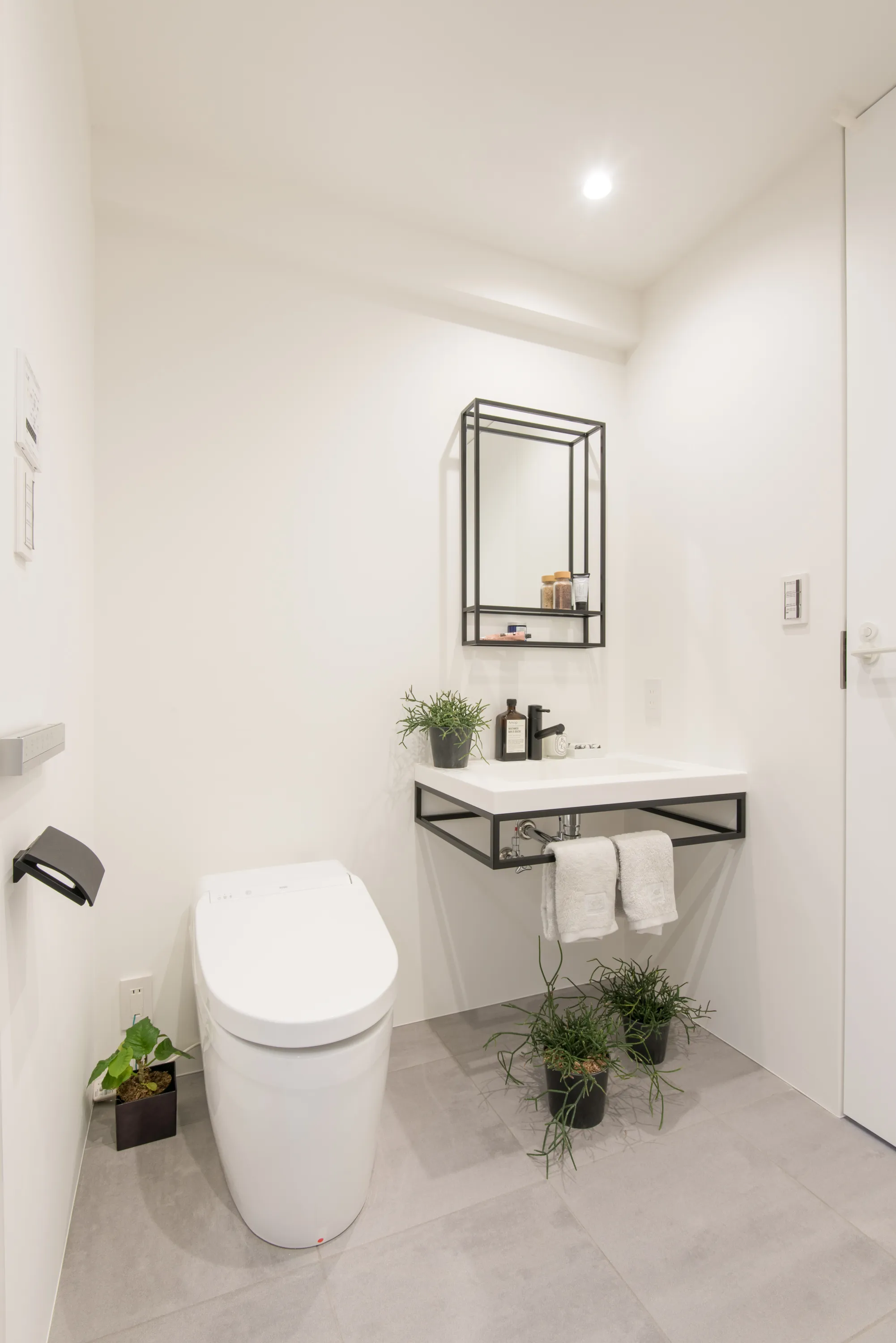 ・洗面化粧台や、ユニットバスのミラー枠、ユニットバスの戸等、細かな意匠まで黒で統一し空間に一体感を作り出します。